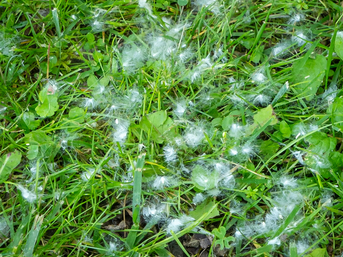 The cottonwood poplar trees spread their seeds individually attached to a piece "cotton fluff" that drifts with the breezes turning the ground white. Sometimes piling up to an inch deep in places.