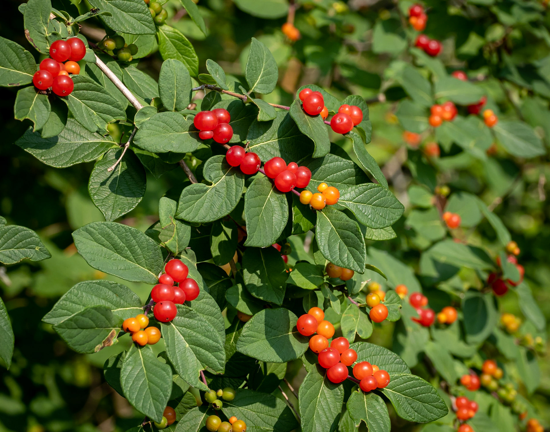Down by the Rideau Canal lock station, the bright honeysuckle berries were ripening. One variety of maple tree/bush had a profusion of maple keys (seeds)