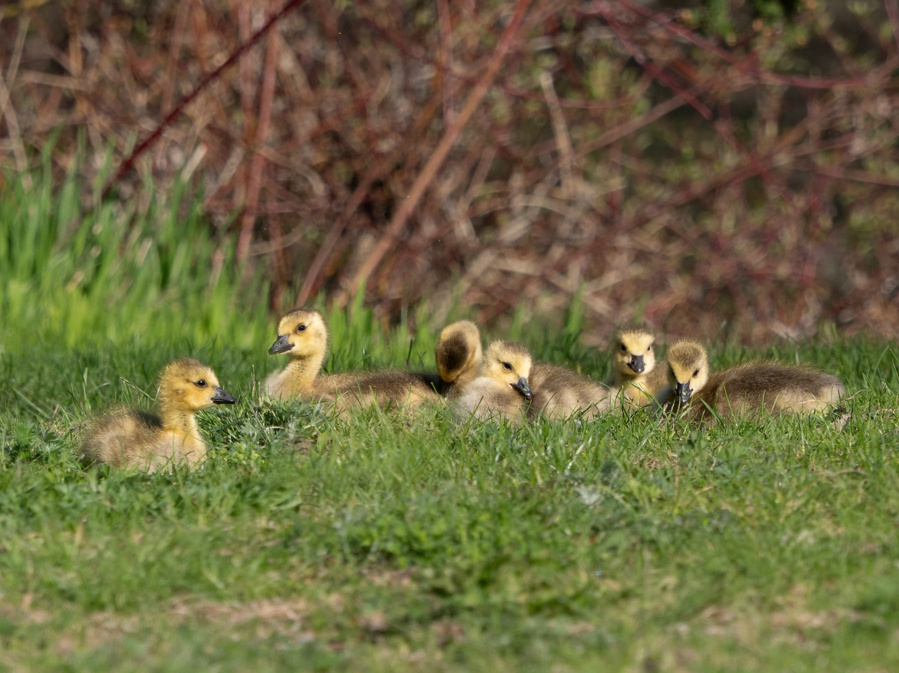 The family with the goslings were down at the west end. One meandered off on its own towards the water so Dad went to keep an eye on it.