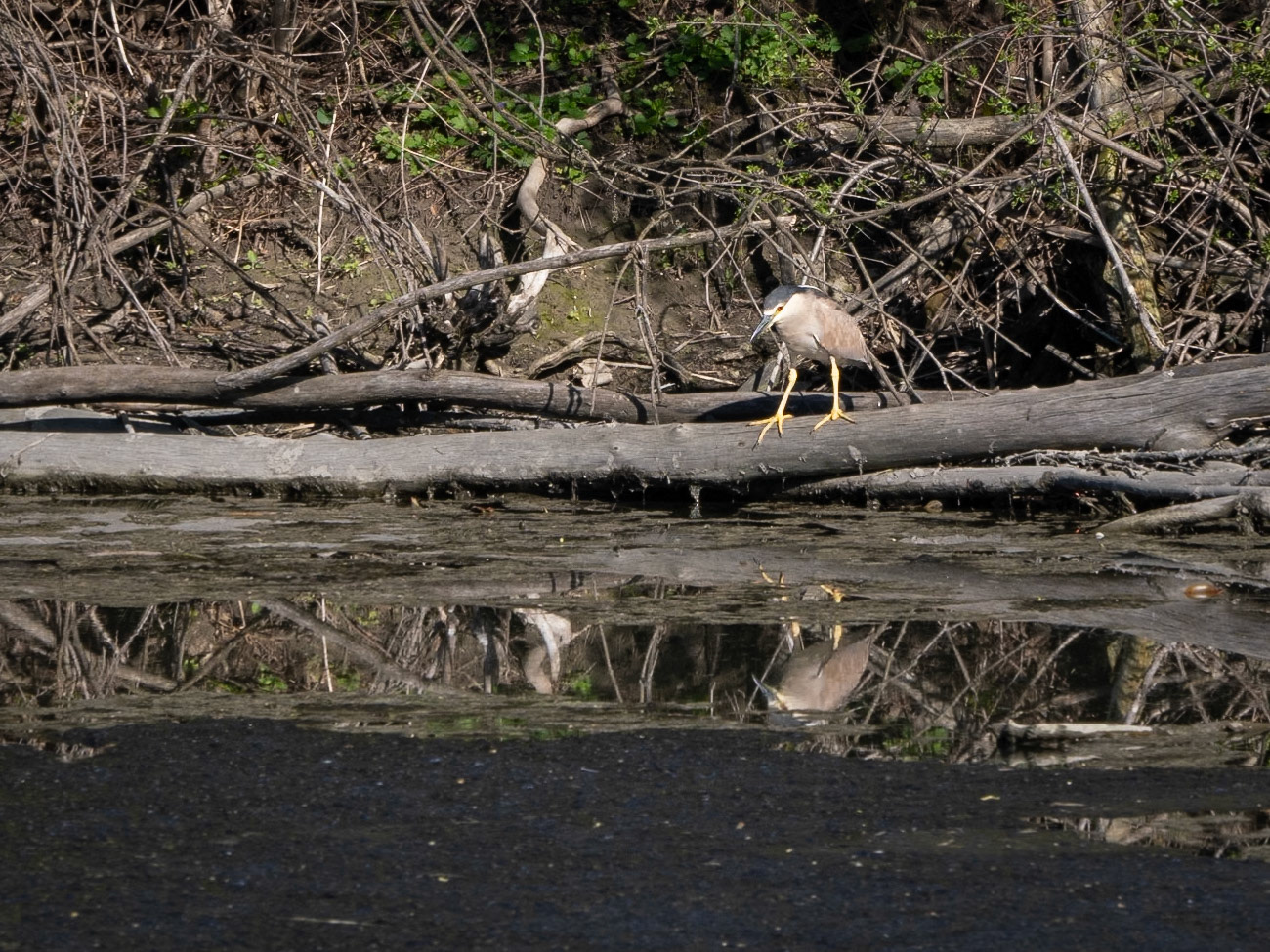 A great blue heron was resting on the far shore, while a black-crowned heron was intent on finding breakfast